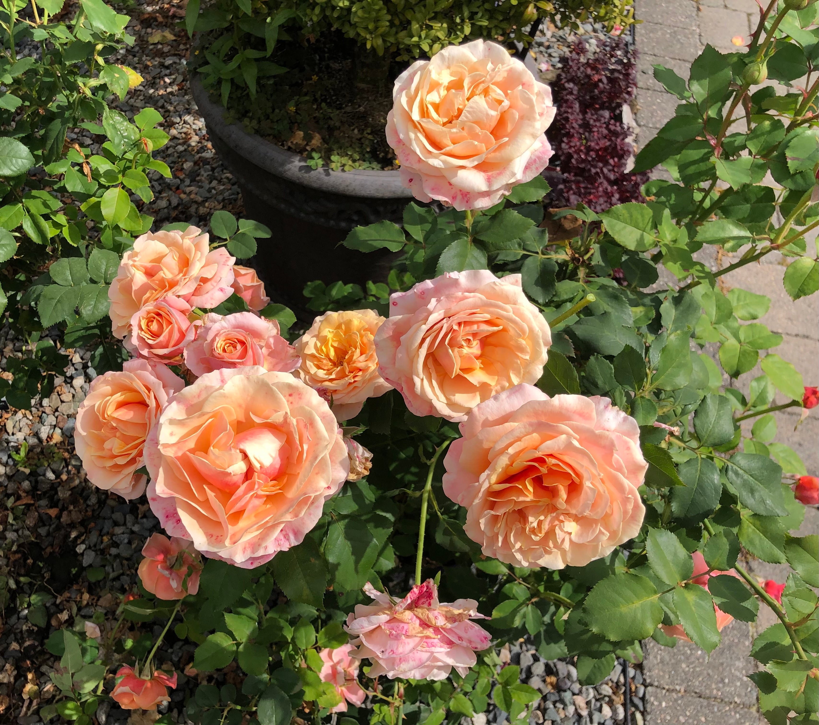 Beverly Anne Clay produces large clusters of blooms that begin as pink, ovoid buds and transition into cupped flowers with softly rounded centres. Each medium to large bloom unfolds in warm apricot tones with a medium pink reverse, releasing a rich fragrance of sweet tea and fresh citrus.