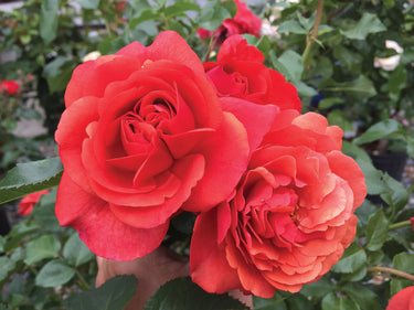 Large sprays of smoky orange-red ovoid buds open into medium, double blooms that mature into rosettes with softly reflexed petals. Foxy Lady reveals a rich, smoky dark orange with a red reverse and releases a delicate fragrance of sweet fruit and tea. A modern rose that beautifully bridges the elegance of historic varieties with the form and vigour of a high-centred bloom.