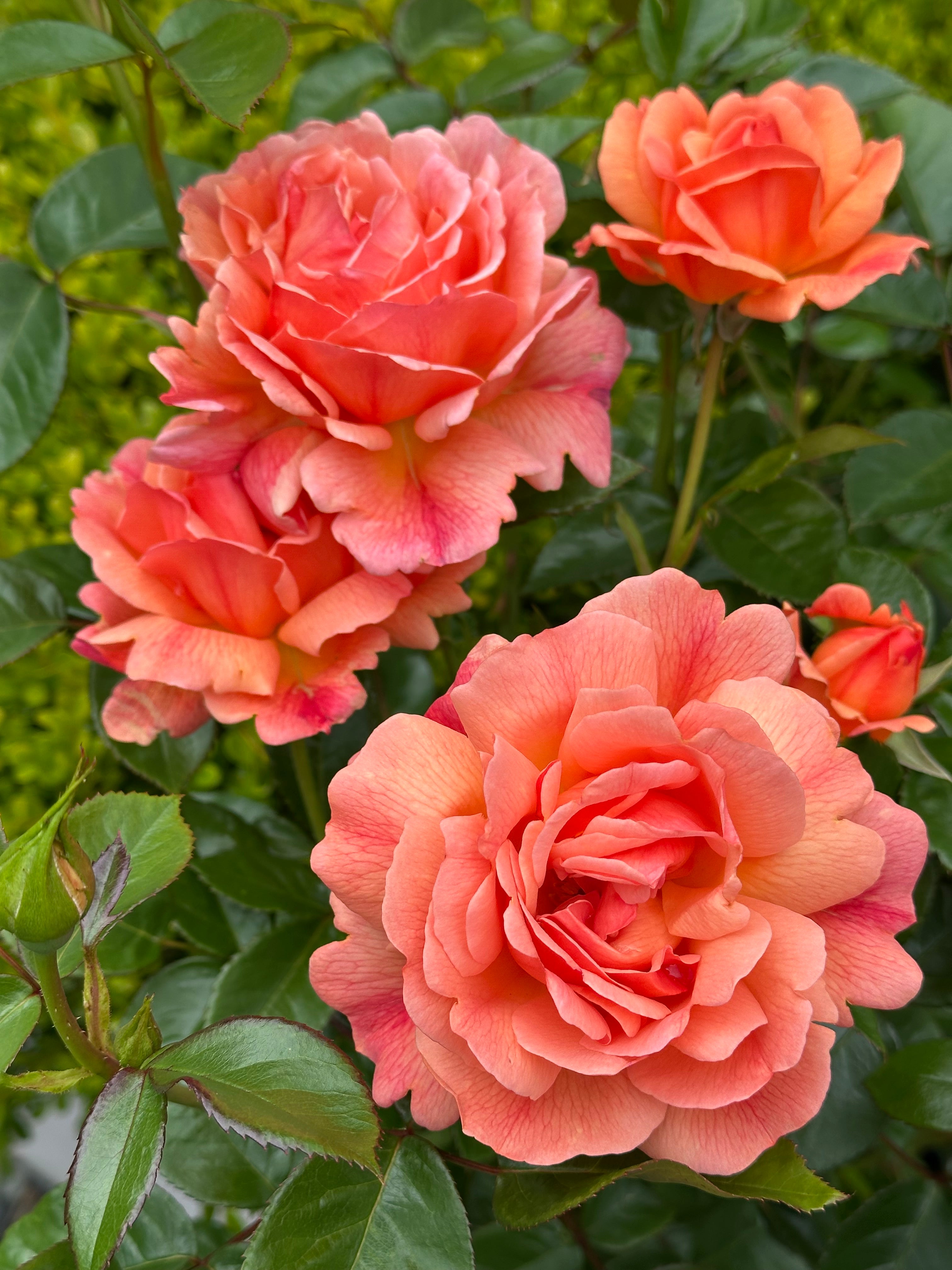 Lady Emily develops from orange-red ovoid buds into cupped blooms that open to rosettes. Producing sprays of medium to large flowers that unfold in rich orange to coral and apricot with darker guard petals, intensifying depending on seasons, releasing a light fragrance of fruit and myrrh.