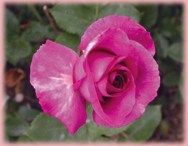 Close-up of a vibrant pink rose with green leaves in the background