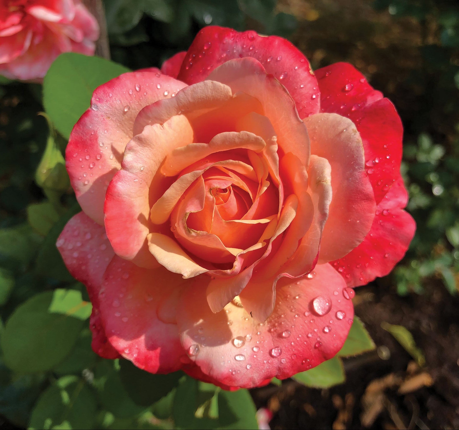 Close-up of a multicoloured rose in pink and apricot with water droplets on petals, surrounded by green leaves.