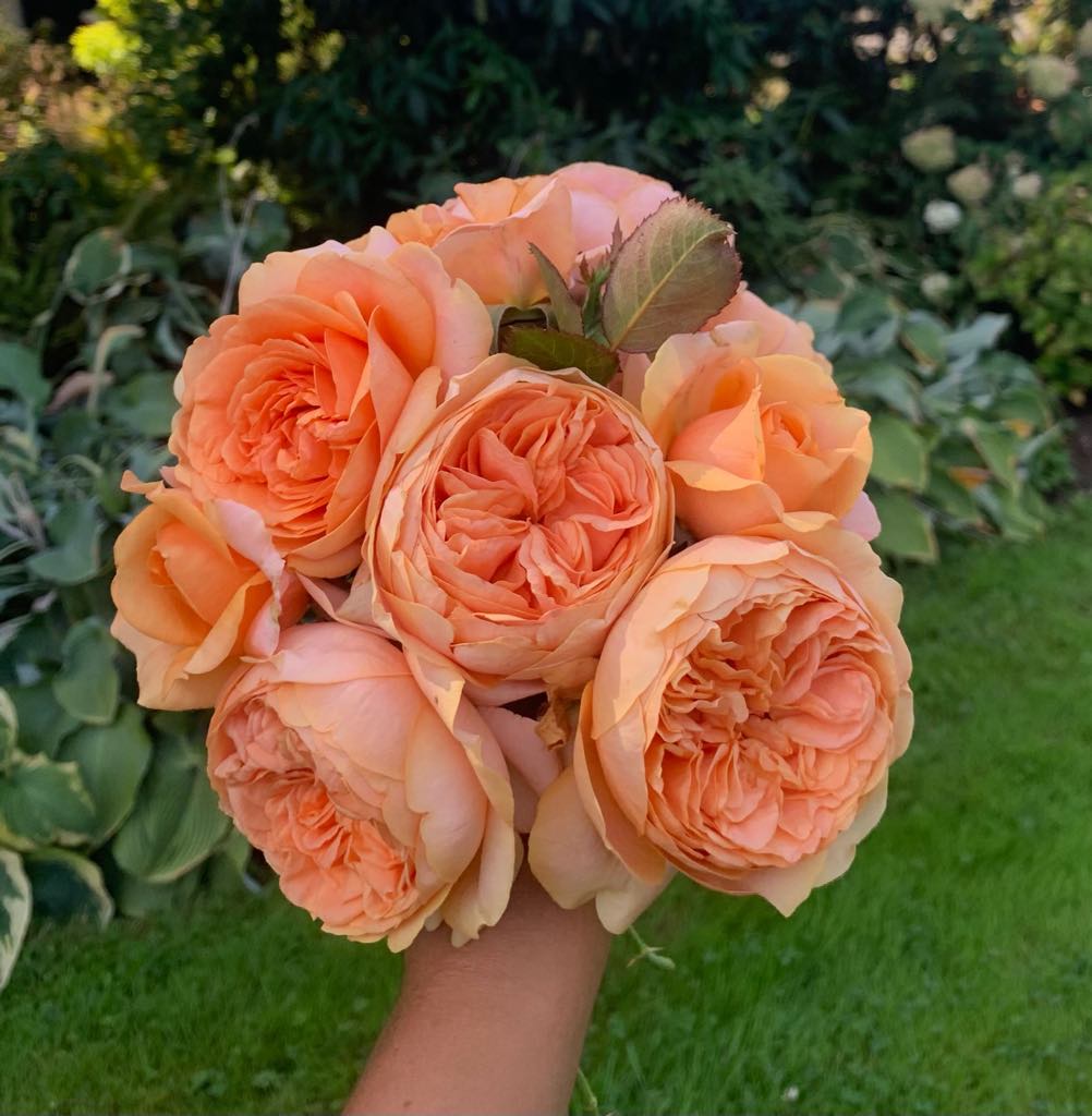Romantic peachy cupped blooms release a mild, sweet, and fruity fragrance of honey and lychee. Double Ambre produces large, very double flowers in rich amber brushed with peachy pink tones. Each bloom opens from a pompom form into a deeply cupped shape with softly scalloped edges - ideal for statement plantings, beds, borders, and containers. This compact shrub bears glowing amber English-style roses with excellent, healthy foliage and high-gloss deep green leaves.