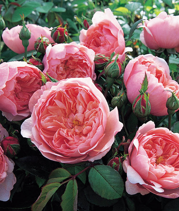 The Alnwick® Rose unfolds from dark pink bulbous buds into medium to large, very double blooms in large groups. The deeply cupped flowers reveal clear pink petals with peachy centre pending temperatures and darker outer petals, opening with delicate scalloped edges. Moderately fragrant with delightful sweet notes combined with raspberry and old rose, this Austin rose offers appealing aromatic quality as the beautiful cupped blooms develop throughout the season.